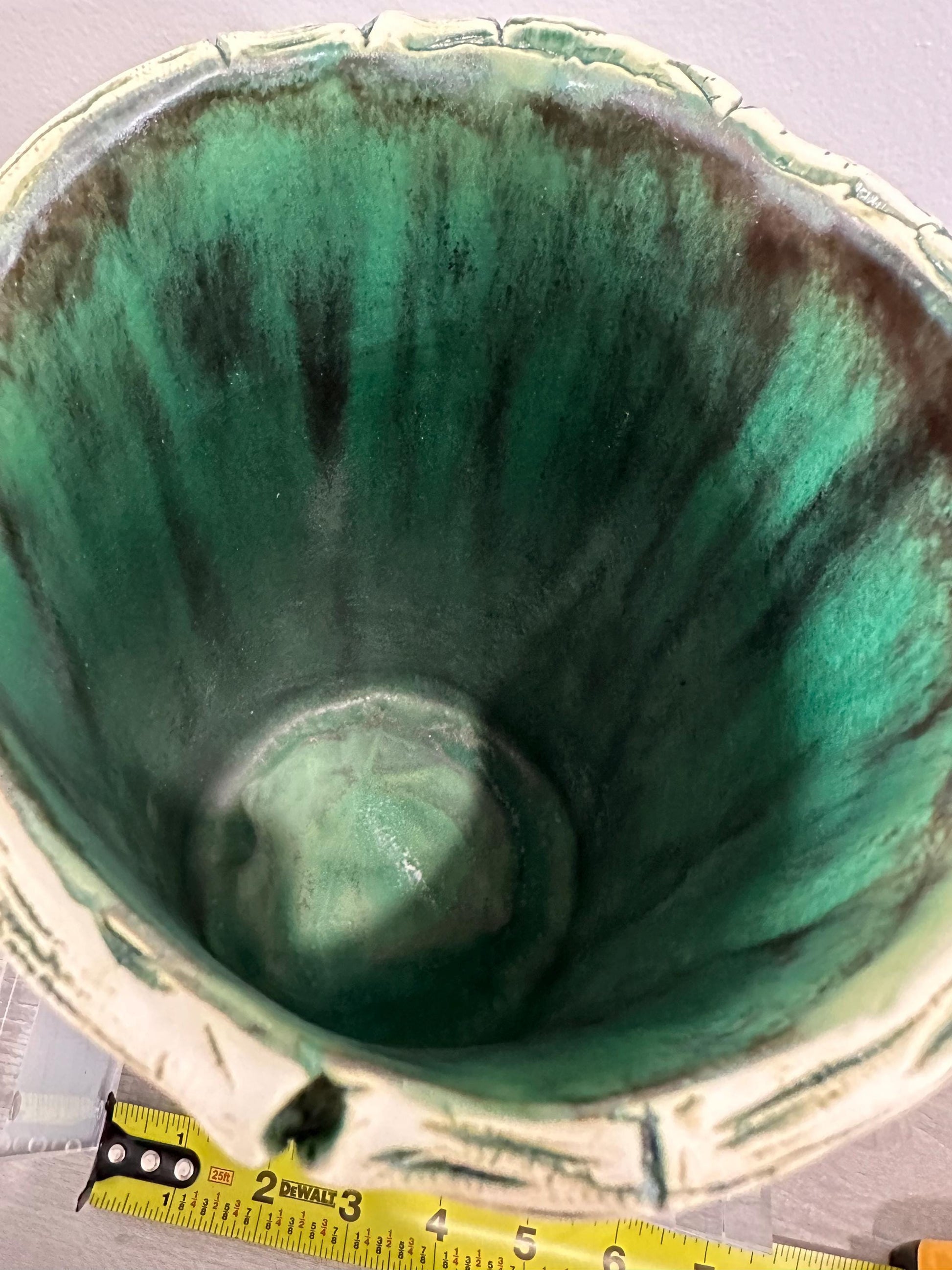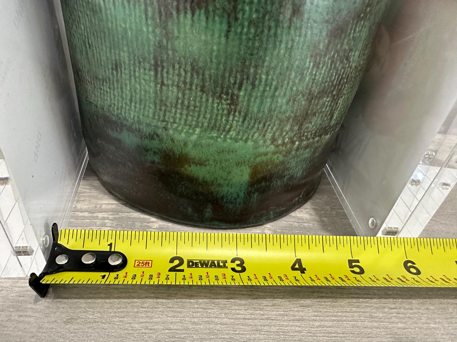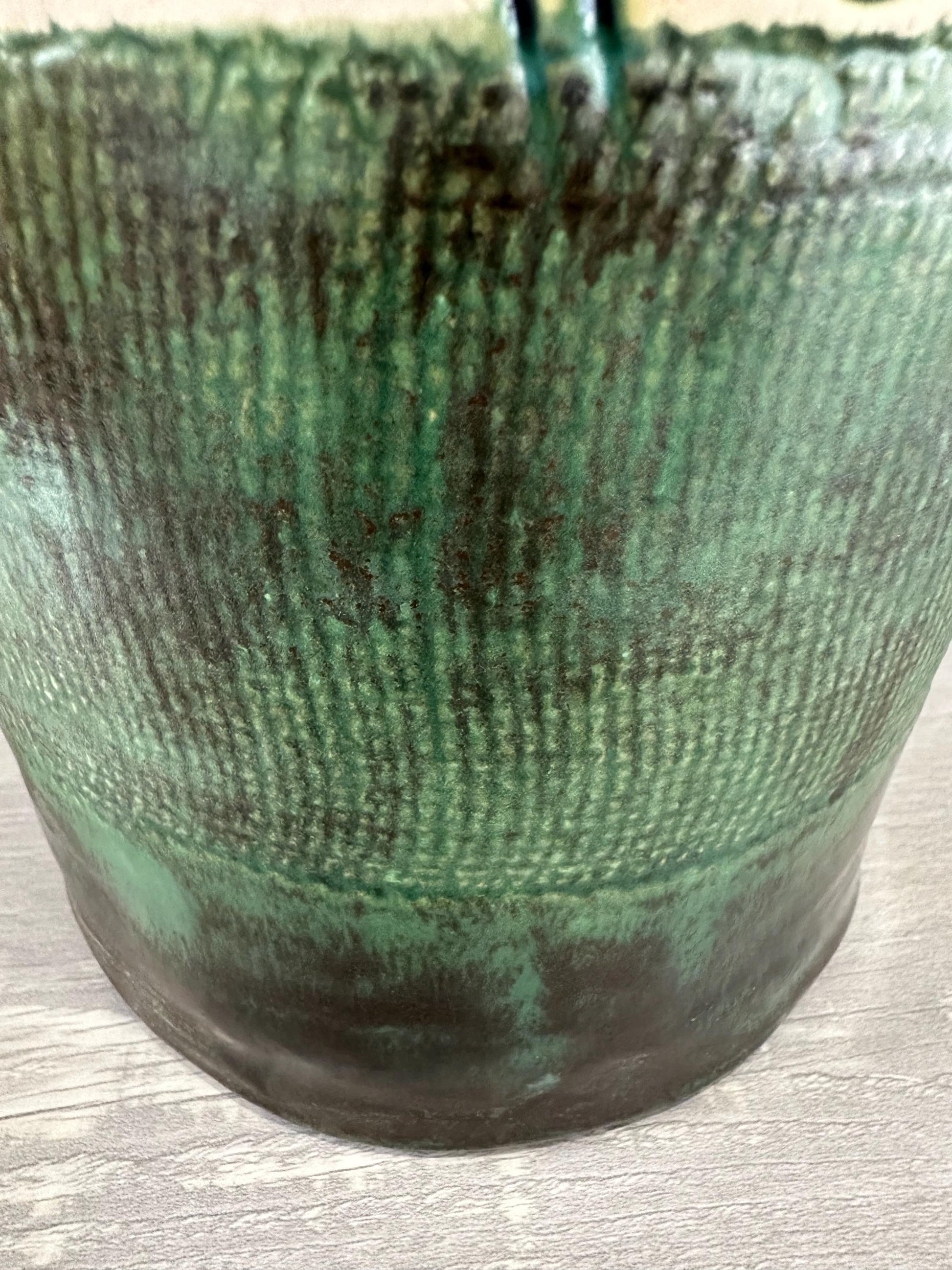 This one-of-a-kind handmade ceramic vase features a striking bamboo motif etched into the clay and highlighted with deep green glaze detailing. The upper half showcases a hand-carved botanical design in earthy tones, while the lower half is finished with a rich, textured forest-green glaze. A unique blend of natural elegance and artisanal craftsmanship, this piece makes a beautiful statement on its own or filled with fresh or dried florals. Perfect for adding a touch of organic charm to any space.